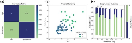 DAS and hydrophone data correlation expressed as (a) a correlation matrix, (b) k-mans clustering, and (c) geographical clustering. The unsupervised classification is performed using the scikit-learn Python library.