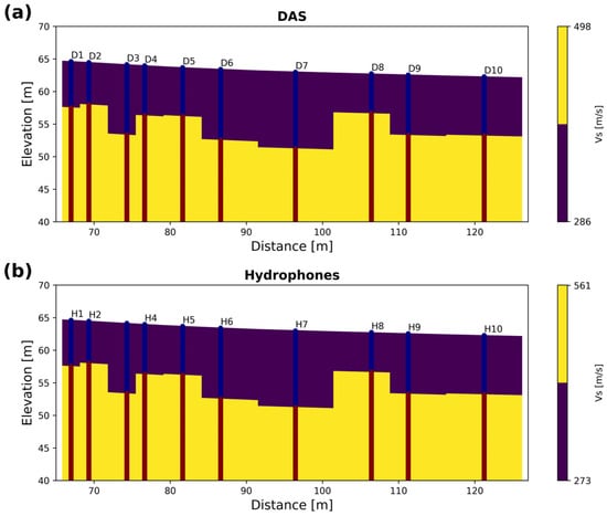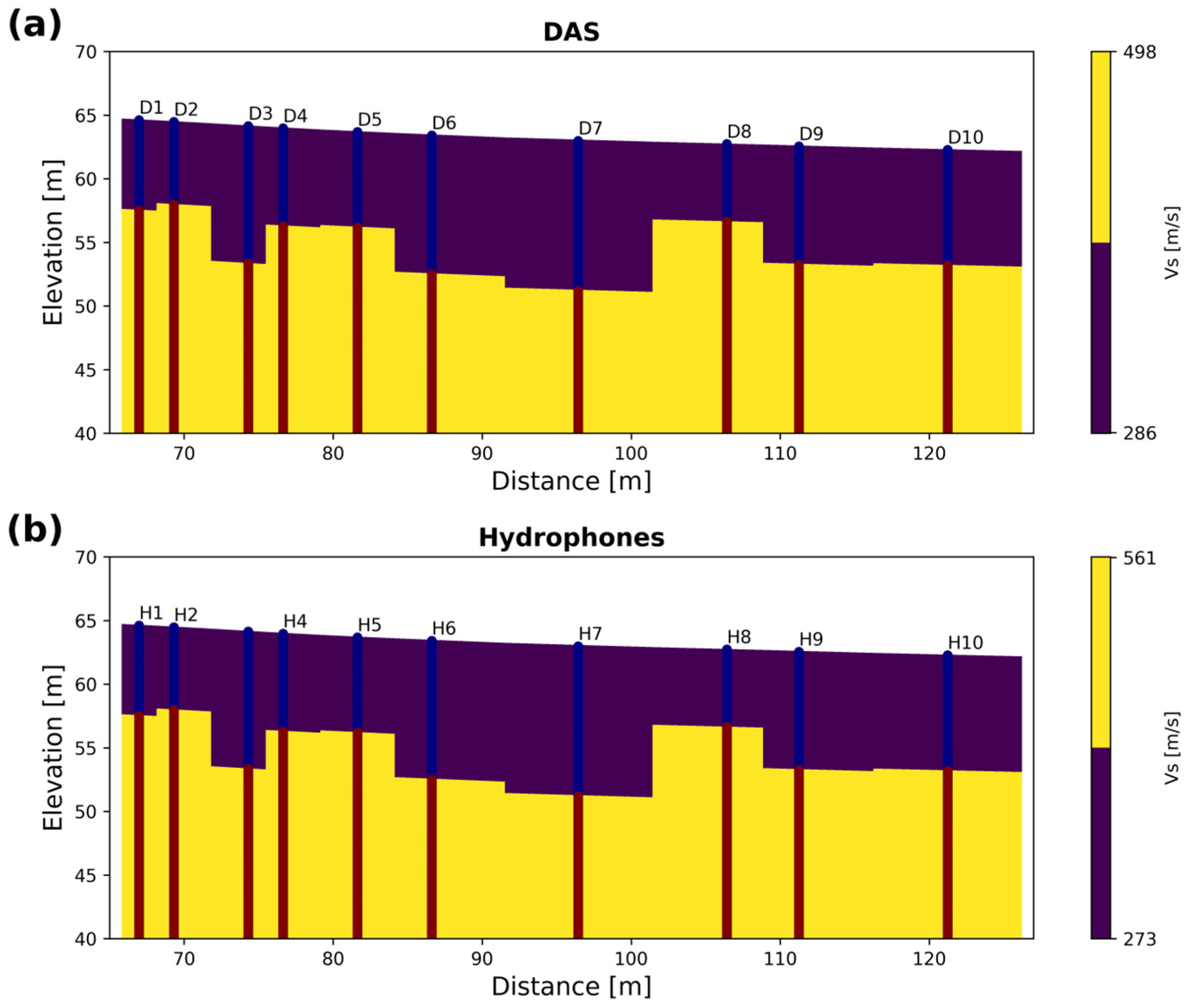 It is important to note that the vertical resolution of DAS is about 2 times lower than that provided by hydrophones, meaning that velocity changes at depths shallower than 6.0 m will not be captured by DAS. Despite the differences in spatial resolution, the DAS succeeded in retrieving the overall velocity structure characterized by a low-velocity sediment layer with a thickness of 7–12 m, overlaying a high-velocity rock formation. It was assumed that hydrophones provide trustworthy information that can be used to somehow validate the DAS results. The S-wave velocities resolved with DAS appeared to be in good agreement with those from hydrophone data. DAS resolved the main layers but not the small variations at shallow depths, which deviated quite a lot from the reference values. This limitation is caused by the lack of energy recorded for the fundamental mode at higher frequencies. This discrepancy in the energy spectra could be explained by the lower spatial resolution of DAS that is imposed by the 10 m gauge length.