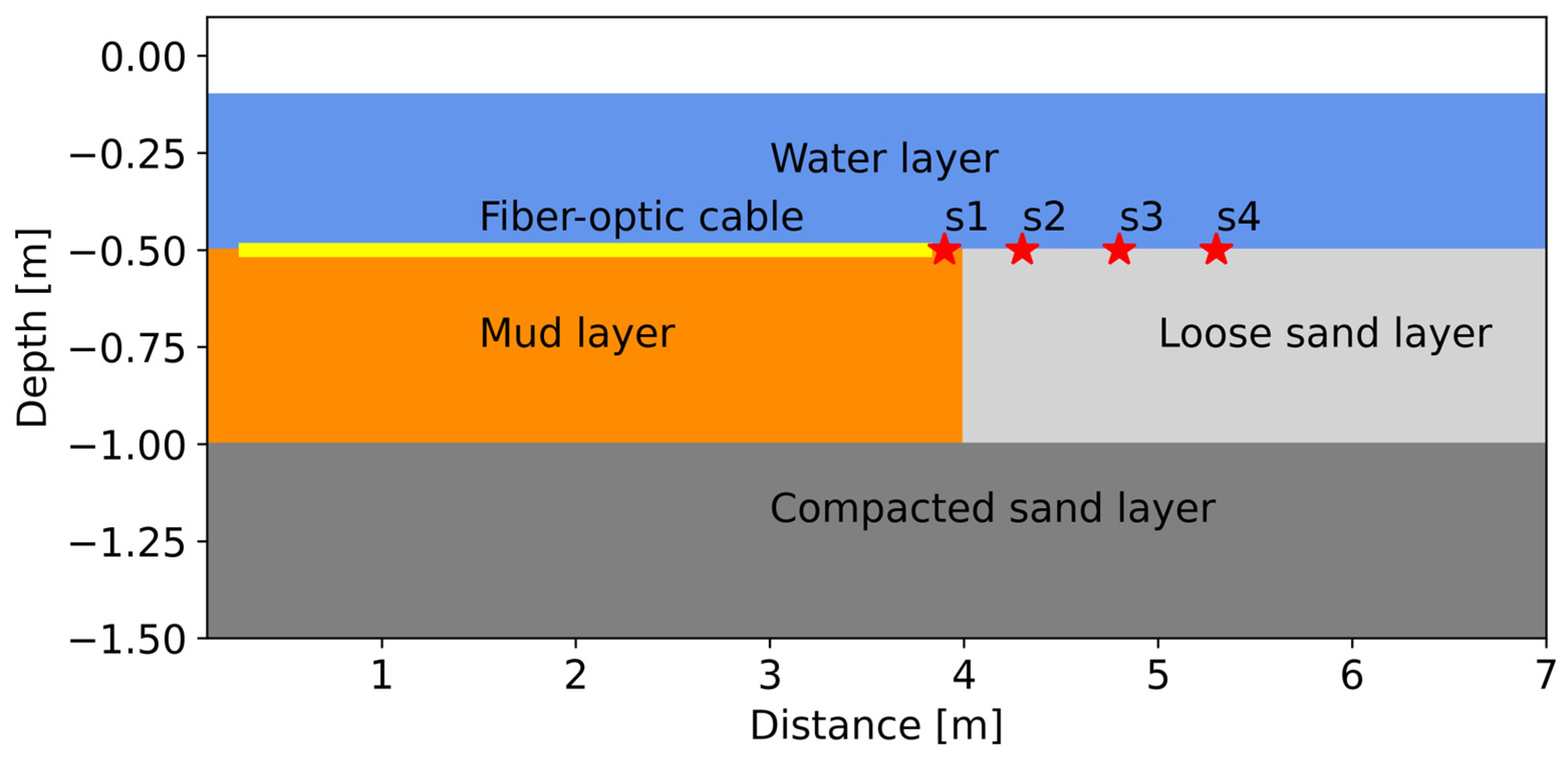 Table 1. The source was placed at four locations in line with the layout at the top of the sand layer with an increasing distance from the first DAS receiver (s1 = 0.1 m, s2 = 0.5 m, s3 = 1.0 m, and s4 = 1.5 m), as shown in
