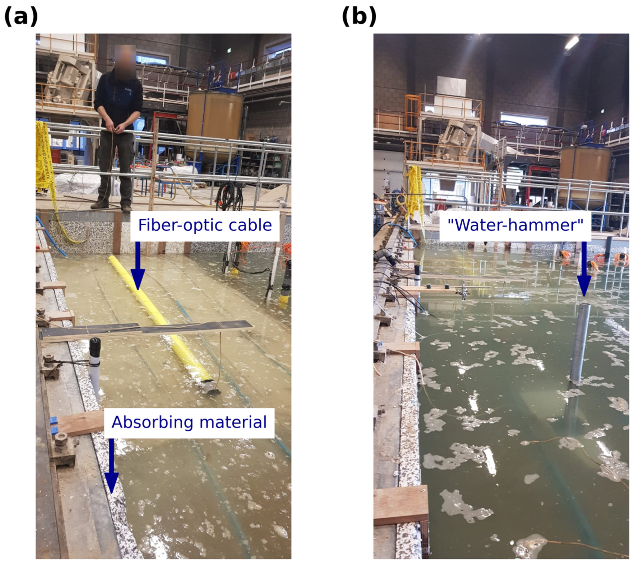 The laboratory experiment was performed in the sand flume of the Geohal facility at Deltares’ main campus in Delft. The set-up was built inside a concrete tank 7.0 m in length, 5.5 m in width, and 2.5 m in depth. The sediment properties and geometries were determined through the preliminary modelling of surface waves. We selected a 0.5 m mud/clay layer overlaying a compacted sand layer with a thickness of 1.5 m. Both layers were covered by 0.5 m of fresh water (