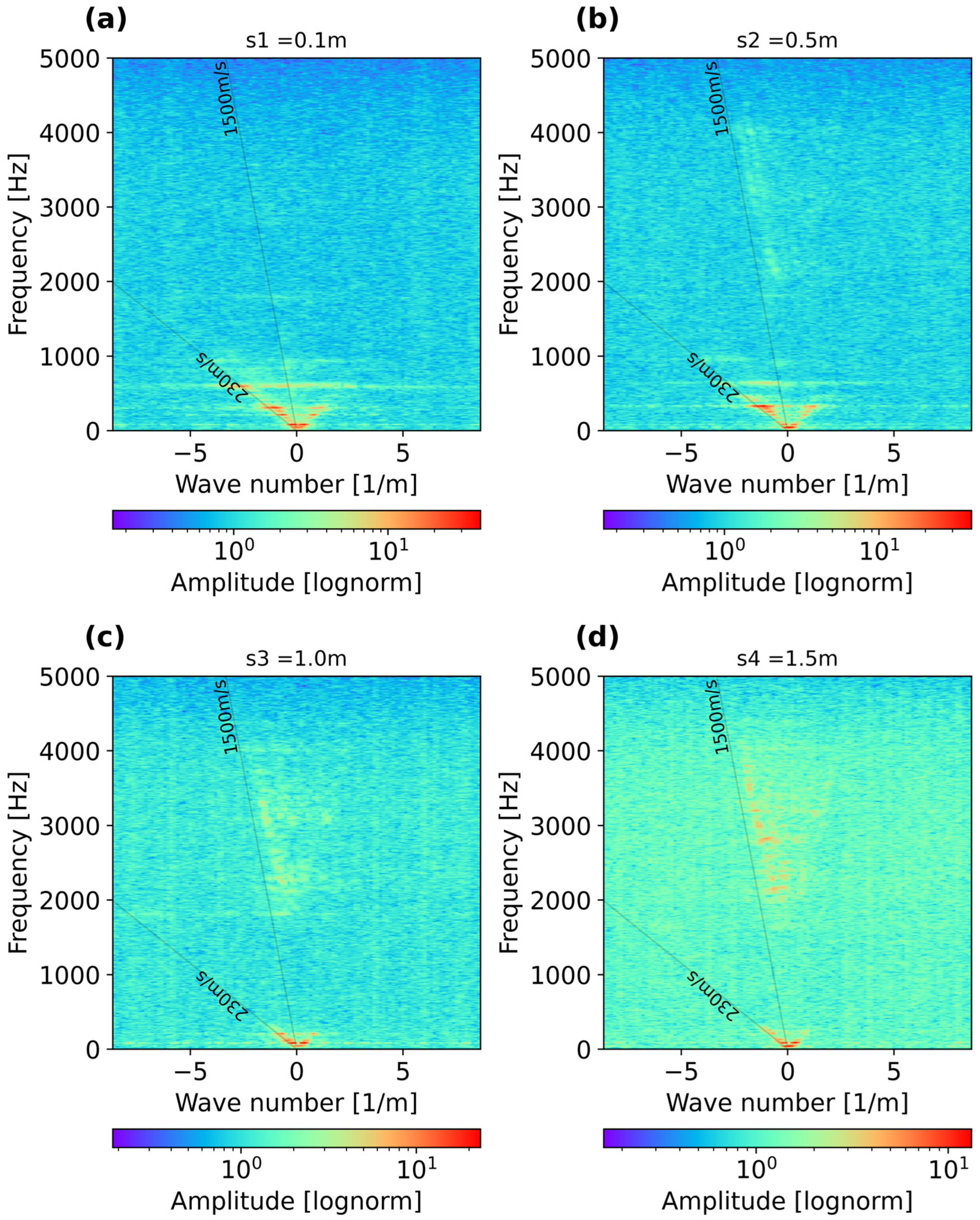 Figure 4 displays the frequency–wavenumber spectra (f-k) for shot-gathers collected with the hammer source at four locations (s1 to s4) at different distances from the fiber, as presented in