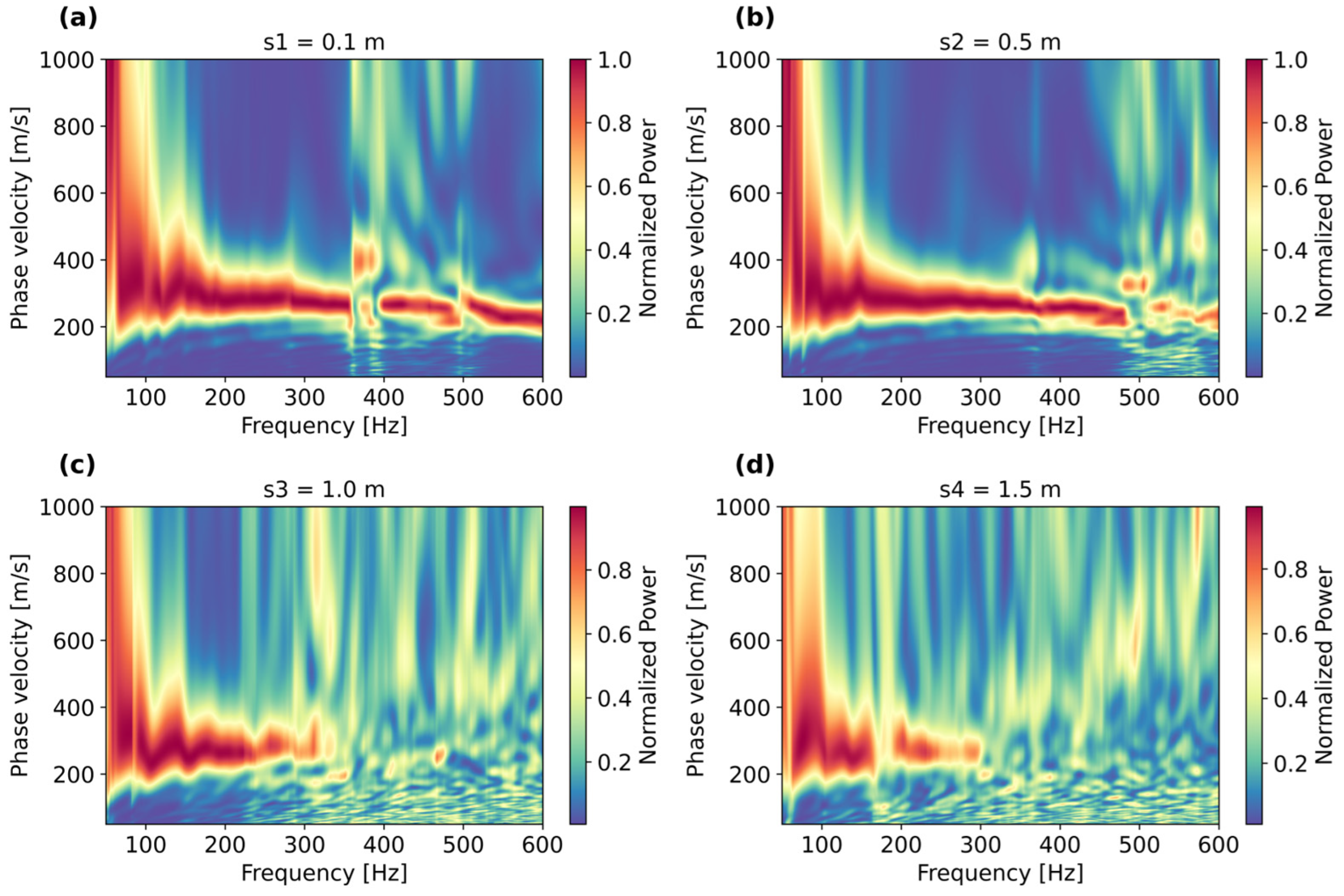 Average phase velocity spectra for source positions at (a) s1 = 0.1 m, (b) s2 = 0.5 m, (c) s3 = 1.0 m, and (d) s4 = 1.5 m.