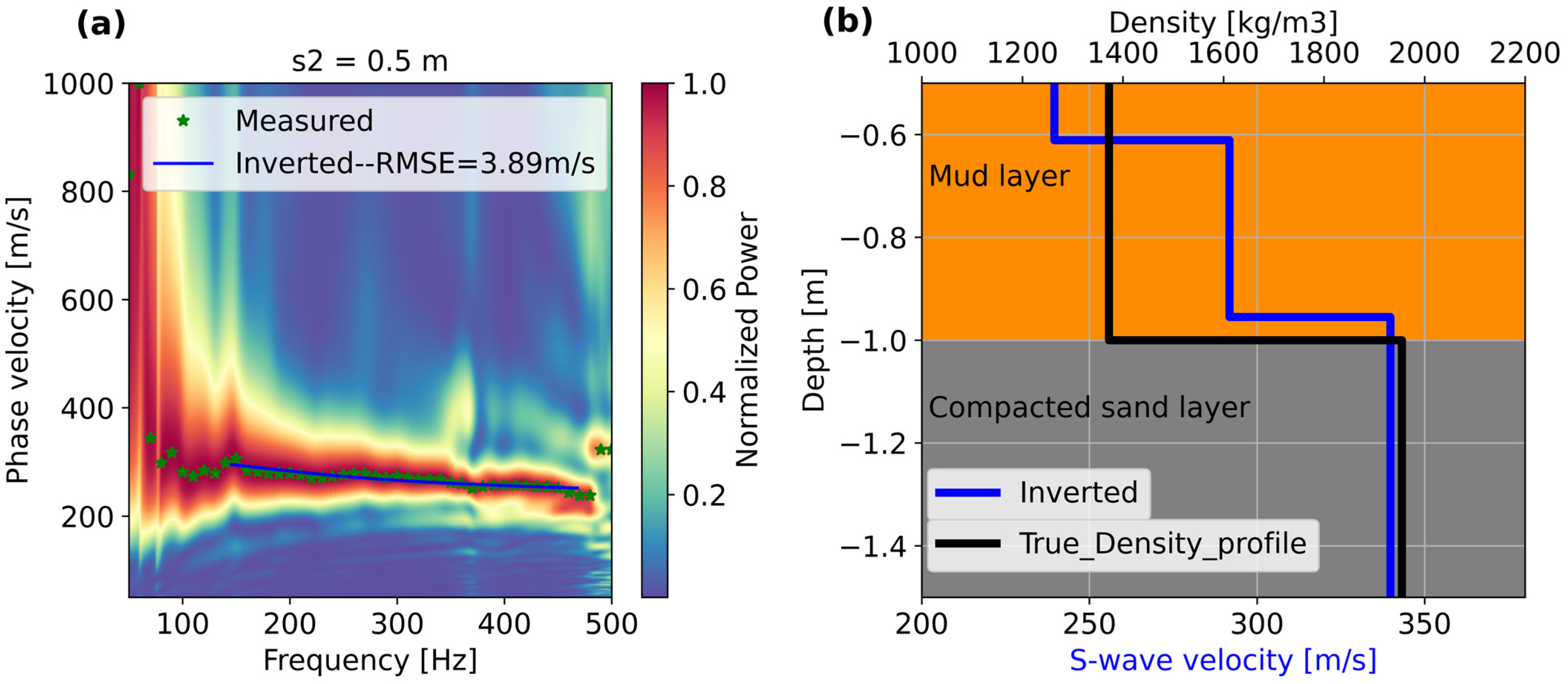 (a) Average phase velocity spectrum at position S2 = 0.5 m and (b) inverted S-wave velocity profile underneath the fiber. The green stars in (a) represent the maximum amplitudes of the phase velocity spectrum.