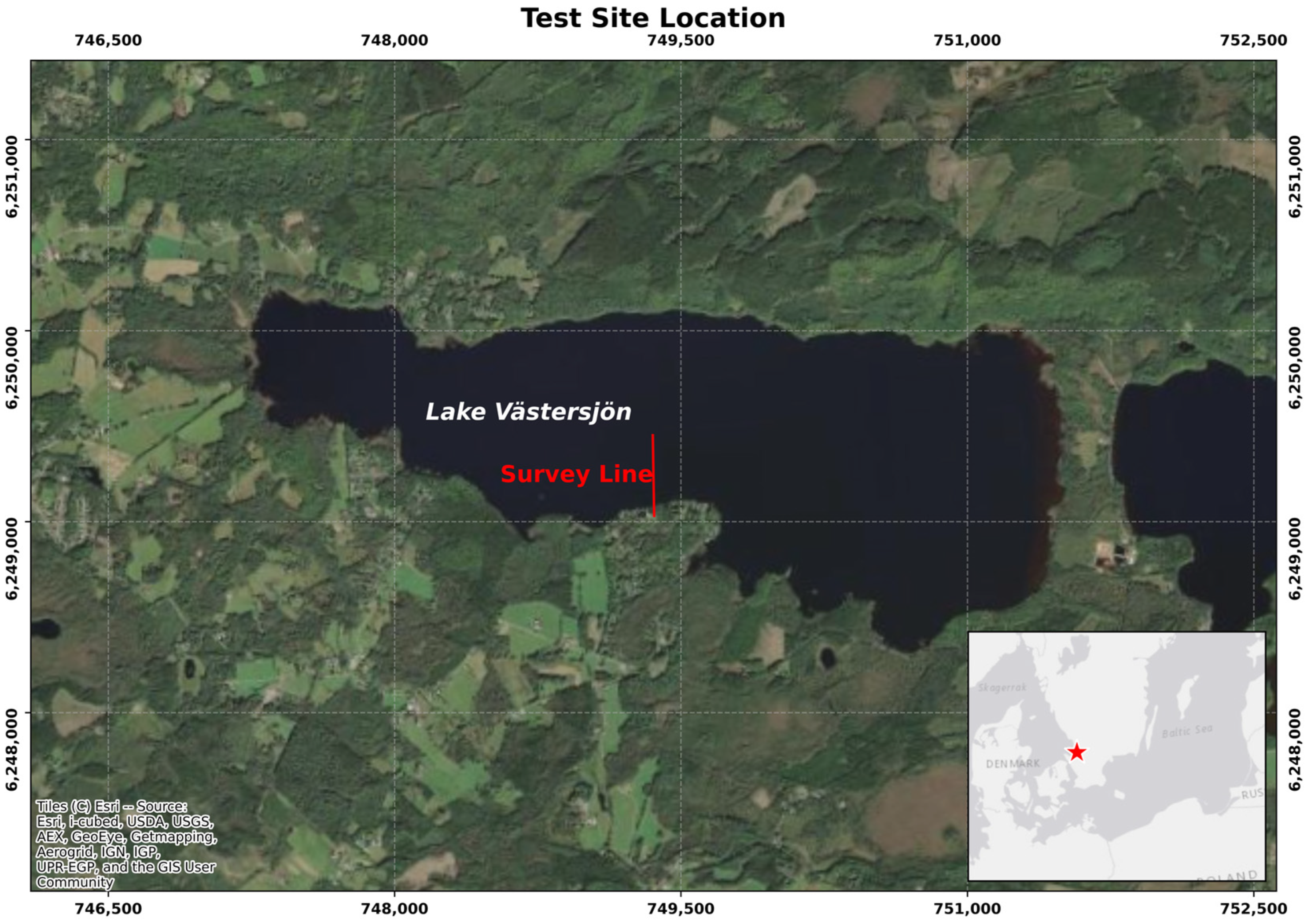 Location map (satellite image from google) of the test site in Sweden. The red line represents the approximate location at which the hydrophone array and DAS cable were deployed. The geographical location of the test site in indicated by the red star.