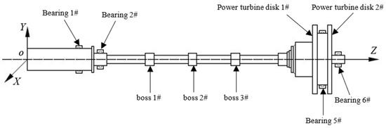 Given the complex structure of aero-engine power turbine rotors, research on such rotors has advanced steadily. Nie [27] considered mass loss and component temperature, and proposed a new method to precisely control the blade fracture rotational speed via precisely prefabricated cracks at the blade root. Nie and Wang [28,29] investigated the influence of oil film radial clearances on the dynamic characteristics of a variable-speed rotor system, and then introduced the principles of equivalent rotor dynamics similarity design. Shao [30] studied the nonlinear dynamic characteristics of a power turbine rotor system with a branching structure, and analyzed the influence of oil-film clearance, length, and viscosity on vibration responses. Yue [31] incorporated the numerical method with modal ratio coefficients among measurement points and the triple phase method, and proposed a new modal balancing process for assessing residual unbalance from different equilibrium planes of a complex flexible rotor system, which was applied to the power turbine rotor. Jia [32] developed a new method to determine the optimal installation position of two-stage turbine disks on the power turbine rotor through vibration optimization design, and deduced the transient response of bearing acceleration and disk amplitude. Nan [33] investigated the influence of rotational speed, misalignment angle, and rub-impact clearance on the dynamics of the power turbine rotor system, and showed that increasing the rub-impact clearance can improve system stability. Cao [34] analyzed the vibration response of a turbine engine’s cantilever rotor under different unbalanced phases and their combinations, and studied the effect of different combinations of unbalanced phase differences on unbalance and dynamic balancing.