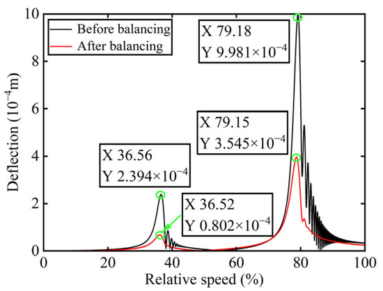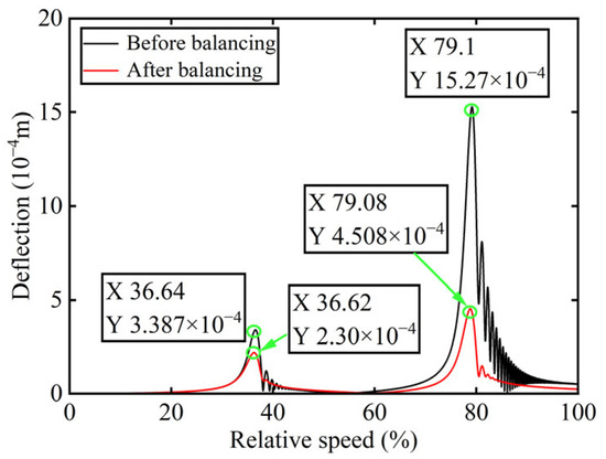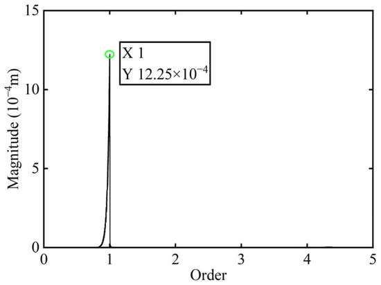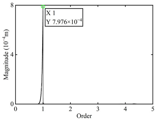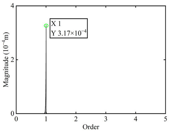 In Figure 3, all minimum values are selected as unbalanced characteristic points to determine the unbalance of the rotor system, enabling the identification of the numerical simulation unbalance value as 0.098 g·mm, and the azimuth of the unbalance is 139.54°. A correction mass of 0.098 g·mm is then added at 319.54° on boss 2. The order spectrum of the rotor’s transient response signal after balancing is illustrated in Figure 4 and the X-direction displacement and deflection of the rotor system before and after balancing are presented in Figure 5 and Figure 6, respectively, with the balancing results summarized in Table 1.