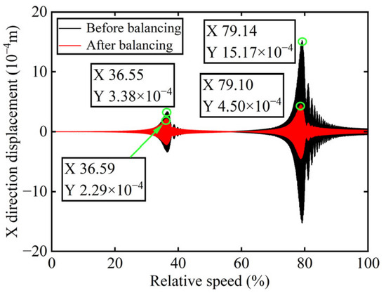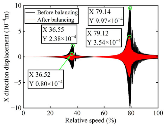 X-direction displacement of boss 2 before and after balancing.
