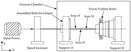 The dynamic balancing experiment on the power turbine rotor was performed using a horizontal high-speed rotation test rig. The installation diagram of dynamic balance experiment of power turbine rotor is shown in Figure 13. The test system is made up of a speed regulation system, air pressure control system, power supply system, and real-time monitoring system. A 400 KW DC motor transmits power from the right end of the gearbox shaft through a two-stage speed increaser, and the power turbine rotor is set in rotation by the output shaft assembly. The output shaft assembly utilized in the experiment is in exactly the same condition as that in the actual engine, and it is fastened to the front bracket via an adapter. The rotor test rig is equipped with both high-speed and low-speed ends, as well as a safety enclosure to avoid overloading of the drive motor. Before the experiment, the air pressure control system needs to be vacuumed. During the startup phase, the rotational speed was managed by professional operators, with an average acceleration of around 13 rad/s2.