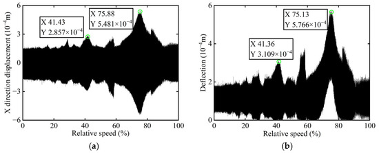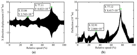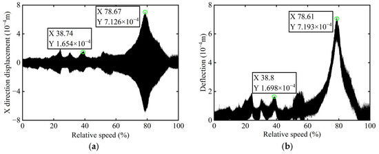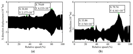 Transient vibration response before balancing of boss 2: (a) X-direction displacement; (b) Deflection.
