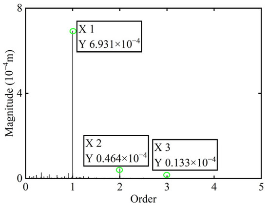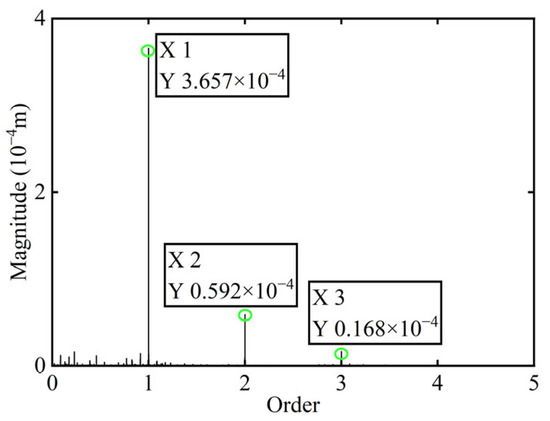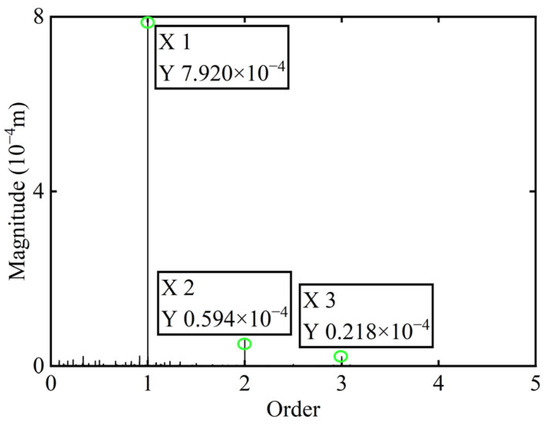 Initially, transient responses are acquired. Following this, unbalanced parameters are determined using computed unbalanced excitation forces based on the modal balancing theory implemented for boss 3. The order spectrum of the rotor’s transient response signal before balancing is illustrated in Figure 7. Meanwhile, the unbalanced excitation forces identified at boss 3 of the power turbine rotor by Equation (4) are depicted in Figure 8.