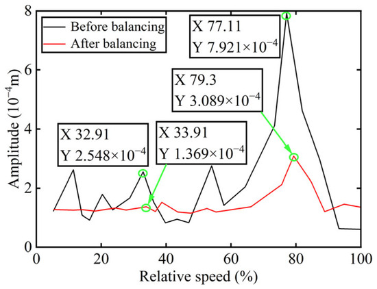 The power turbine rotor operates at a relatively high speed. Therefore, to clearly illustrate the variation in the rotor’s amplitude with rotational speed before and after balancing, the relative rotational speed is defined as