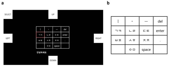 Figure 2. Monitor interface and keyboard layout of the EMG-based Cheonjiin speller. (a) The monitor interface displays directional command keys (UP, DOWN, LEFT, RIGHT, SELECT), which control cursor navigation and briefly flash when activated. The Cheonjiin keyboard layout is centered on the screen, and the text shown below it (e.g., “안녕하세요”) represents the user’s real-time input. The red box highlights the currently selected key; (b) The Cheonjiin keyboard layout consists of Korean vowels (ㆍ, ㅡ, and ㅣ) and grouped consonant keys (ㄱㅋ, ㄴㄹ, ㄷㅌ, ㅂㅍ, ㅅㅎ, ㅈㅊ, ㅇㅁ) arranged to reflect the principles of the Cheonjiin input system.