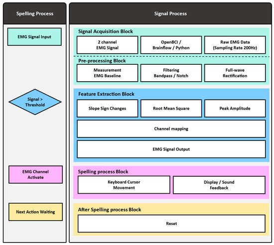 Figure 4. Flowchart of the proposed EMG-based Cheonjiin speller system, showing signal preprocessing and cursor control steps.