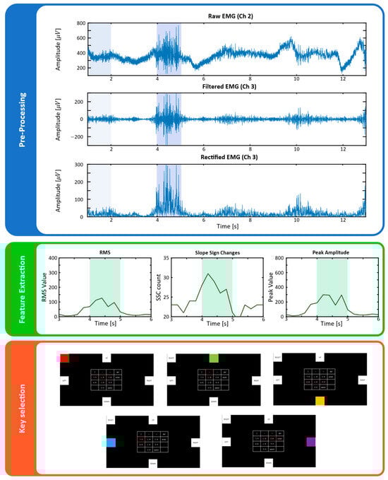 Figure 5. Signal processing and feature extraction of EMG signals, including preprocessing, feature computation (RMS, slope sign changes, and peak amplitude), and key selection. In the preprocessing plots, the light blue region (0~2 s) represents the baseline measurement period, whereas the darker blue region indicates the segment used for signal processing. The light green region shown in feature extraction plots corresponds to the same processing segment highlighted in the prepro-cessing stage.