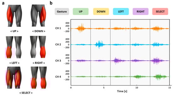 Figure 6. (a) Illustration of five input gestures based on rectus femoris and gastrocnemius muscle activation; (b) EMG signal recordings from individual channels showing variations during muscle contraction and relaxation for each gesture.