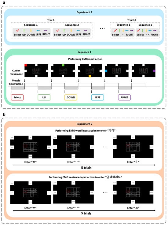 Figure 7. (a) Experiment 1 illustrating the control of five distinct commands (UP, DOWN, LEFT, RIGHT, and SELECT) through EMG gestures; (b) Experiment 2 illustrating the word-input task and sentence-input task using EMG-based directional control.