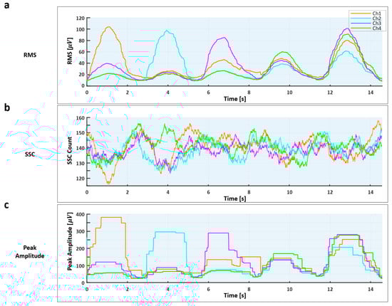 Time-domain features were selected for their proven reliability in EMG-based classification and suitability for real-time implementation. Among various candidates, RMS, SSC, and peak amplitude were chosen based on their physiological interpretability and consistent discriminative performance reported in prior EMG studies. These features have been extensively employed in surface EMG analysis for their ability to capture distinct yet complementary aspects of neuromuscular activation [29,30]. Specifically, RMS quantifies the effective power of the EMG signal and correlates with the level of motor unit recruitment, making it a reliable indicator of contraction strength. SSC measures the frequency of slope reversals between successive samples, providing sensitivity to transient changes in contraction dynamics and muscle fatigue. Peak amplitude serves as an auxiliary descriptor that reflects short-duration, high-intensity activations which may not be fully represented by RMS alone.