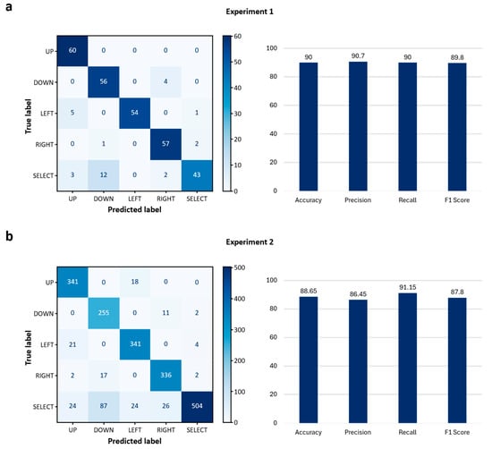 Experiment 1 was conducted with a total of 3 subjects, each of whom repeatedly performed the 5 input actions, which are ‘up’, ‘down’, ‘left’, ‘right’, and ‘select’. According to the confusion matrix derived from the collected 300 data points, the proposed system demonstrated high classification accuracy across most classes. As shown in Figure 9a, the system achieved perfect classification for the ‘up’ class, while the ‘left’, ‘right’, and ‘down’ classes also demonstrated high accuracy with only a few misclassifications. In contrast, the ‘select’ class exhibited the lowest accuracy, frequently confusing it with the ‘left’ and ‘up’ classes.