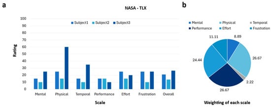 Additionally, to assess the subjects’ subjective cognitive workload, the NASA-TLX questionnaire was administered after the experiment concluded. The results are presented in Figure 10. This questionnaire is structured to evaluate six items: Mental Demand, Physical Demand, Temporal Demand, Performance, Effort, and Frustration. Across participants, the overall workload scores ranged from 13.7 to 26.3, corresponding to a medium perceived workload level. As shown in Figure 10a, most individual item scores remained relatively low, generally between 10 and 30 points, with the exception of Physical Demand and Temporal Demand, which reached higher values for certain subjects. The pie chart in Figure 10b illustrates the relative weighting of each item, showing that Physical Demand accounted for the largest proportion at 26.7%, followed by Performance at 26.4% and Effort at 24.4%. Temporal Demand showed the lowest contribution, and both Mental Demand and Frustration were also minor components of the overall workload. These results confirm that while the proposed input system may impose some degree of physical burden, particularly in terms of muscular effort, it does not generate excessive cognitive load, time pressure, or emotional stress. Overall, participants perceived the workload as moderate and manageable, suggesting that the system can be adopted without substantial difficulty.