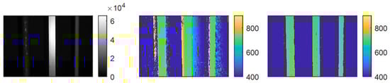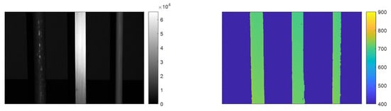 All the images are stacked into a 3D cube I c ( m , n , p ) where m , n is the row/column of the images, p is the pattern index (and represents time), and C { 1 , 2 } represents camera index. We subsequently detect two peaks per camera pixel in both of the cameras, i.e., find the two strongest peaks P c m , n , i in the p dimension of each of the I c cubes. Peaks are determined by finding local maxima and subsequently measuring their amplitude relative to a zero signal, selecting the two strongest peaks using amplitude as a metric. Peaks weaker than a fixed threshold are discarded. The peaks represent practice columns in the projector, and we use the camera–projector calibration to perform triangulation between the camera pixel and the projector column. This provides up to two 3D coordinates Z c m , n , i per camera pixel in each of the cameras.