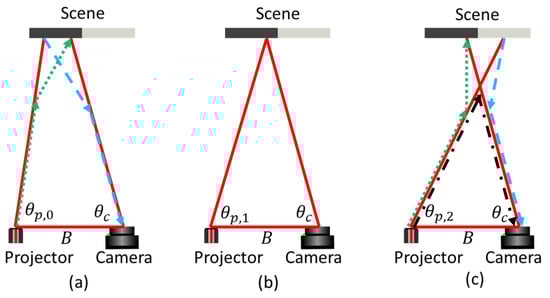In practice, one may select several strategies for ensuring a return signal in the pixel with an observation angle θ c . For now, we shall assume that we project a line perpendicular to the baseline, and that we vary the projection angle to span the entire field of view of the projector in t = [ 1 , t m a x ] discrete time steps θ p t = θ p , m a x + 2 θ p , m a x t t m a x . For the simple case shown in Figure 2b, the camera observes, at θ c , a bright signal I t at the time when θ p ( t ) = θ p , 1 .