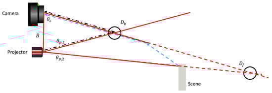 Figure 4. Three-dimensional data outside of an object. Backscatter (black, dash-dotted) forms a maximum signal when projecting at θ p , 1 , perceived as an object at distance D b . Forward scatter (blue, dashed) forms a maximum signal when projecting at θ p , 2 , perceived as an object at distance D f . The red-dashed lines indicate the viewing angles of the pixels of the camera/projector that observe/contribute to the false forward scatter object detection.