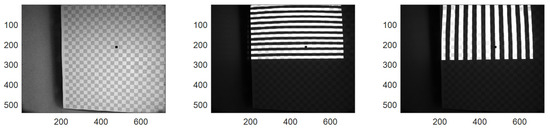 Figure 6. Example calibration images. Left: Camera image of a checkerboard with a black dot to ensure corner identification, using ambient room illumination. Mid: Projector projecting horizontal gray-codes. Right: Projector projecting vertical Gray Codes.