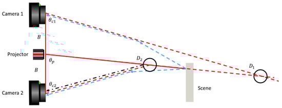 Figure 7. Dual-camera setup with a projector for scatter identification and removal. The projector emits a single line onto the scene, received by Camera 1 and Camera 2. Direct transport (solid red lines) can be distinguished from the forward-scatter transport (dashed blue lines) as the triangulation points D 2 ,   D 1 , 2 differ for the forward-scatter transport.