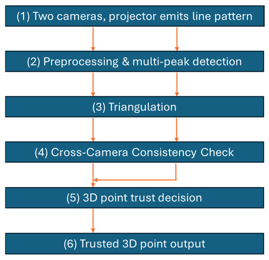 Figure 8. Overall flow chart for the algorithm. Steps 1–3 are performed per camera using a regular stereo/camera–projector 3D triangulation pipeline (dual vertical arrows). Steps 4 and 5 (this paper) introduce the cross-camera consistency check that enables trust classification and forward-scatter removal.