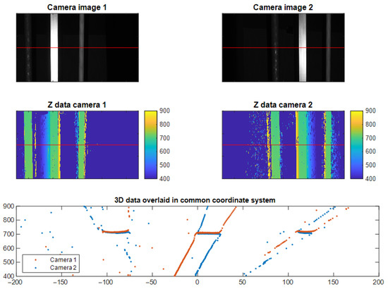 More formally, the 3D observations in each camera pixel for the camera C will be in the set O C ( i ) = { , } , S C , , T C , , T C , S C , S c , S C , C [ 1 , 2 ] , where T C refers to a 3D measurement from a true surface, S C , S C are measurements due to scattering, and i [ 1 , 2 ] is the measurement index. As the points have been transformed into the same coordinate system using the camera–camera calibration, we can reasonably assume that T 1 T 2 < t for true measurements. If one of the measurements O C i S C , S C are due to scatter, then it is highly probable that O C i O C ( i ) t . Furthermore, we would expect min i 1 ,   i 2 | O 1 i 1 O 2 i 2 | < t only to be the case if T C is present in both sets.