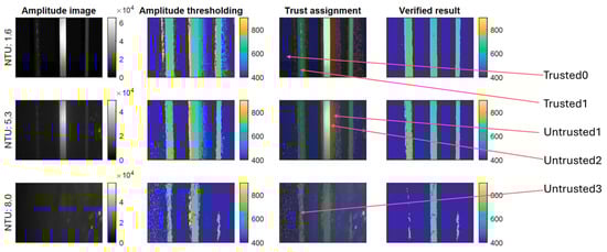 In practice, there will be cases where, due to noise fluctuations or other factors, scattered points randomly happen to correspond to true measurements, meaning that the logic needs to be made slightly more complicated to cover all relevant cases. Table 2 thus captures the full set of distance classes that the algorithm may receive as input, and the corresponding trust consideration of the resulting data. In particular, this table covers the cases where, due to random chance, both points are classified as being “close”—e.g., one true measurement where random noise causes the scattered point to also be aligned. The trust considerations in Table 2 can be summarized as follows: