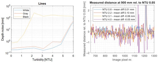 In this work, our performance goal is to be able to determine whether a 3D measurement represents a true 3D measurement, or whether it is a possibly false data point due to scattering or other imaging artifacts (shadows, etc.). This means that the usual 3D metrics like 3D precision and accuracy are not the primary focus of the work described herein and will not be directly relevant for providing useful performance values. That being said, it should be noted that the method described in Section 3.2 is purely a filtering method, and that a valid 3D point is a point that is measured by both camera systems. As such, a naïve implementation to assess 3D performance would be to use, e.g., all verified 3D data points as measured by Camera 1. In this implementation, 3D precision is equal to that reported in [20], i.e., 0.2 mm precision at 1 m distance for turbidities < NTU 4. For completeness, the measured 3D precision vs. turbidity is shown in Figure 12. Measured 3D at 900 mm distance varies by <0.1 mm across turbidities, meaning that the calibration is unaffected by turbidity to approximately 1 part in 10,000.