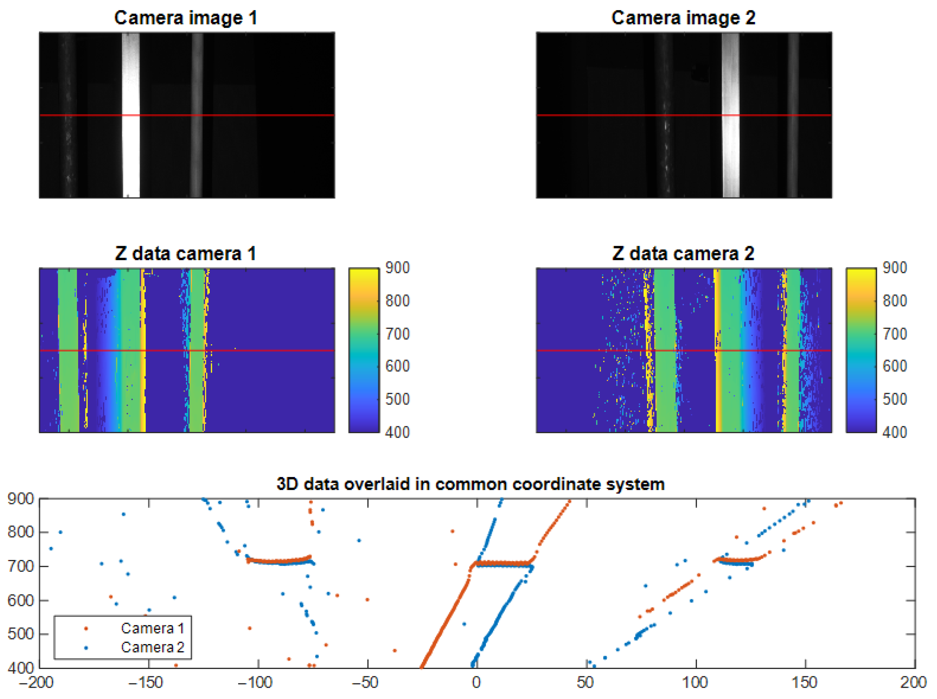 - For each of the transformed measurements from Camera 1, find the 3D camera measurement that is closest in Camera 2 as described in point 1. As the pixel indices in Camera 2 for searching the closest measurements have been found through calibration, this process can be performed very quickly without the need for, e.g., kd-trees [28].