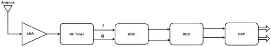 The use of SDR is fundamental and essential to achieving the desired objectives, as it allows for the simultaneous analysis of a high range of frequencies, which would not be possible with analog receivers. This is due to the structure of the SDR, as shown in Figure 3, where most of the processing is performed digitally, allowing great flexibility both in the operating range and in the necessary filtering levels and desired amplification. The Low Noise Amplifier (LNA), the RF Tuner and the Analog-to-Digital Converter (ADC) together form the radio frequency front end responsible for selecting, amplifying and converting the incoming RF signal into the digital domain, while the Digital Down Converter (DDC) and the Digital Signal Processing (DSP) modules are where all demodulation, filtering, and signal analysis occur. This process ensures a level of efficiency and precision that analog receivers are not capable of.