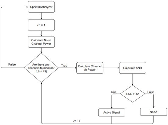 After calculating the noise power level, it is necessary to define a list with the frequency of each of the 48 channels to be monitored so that the algorithm can loop through it. For each channel, the point corresponding to the channel’s center frequency in the FFT value vector is calculated. Then, each of the frequencies that compose the channel’s bandwidth is added together, and once the sum is obtained, the total power value of the respective channel is obtained. With the total power of the communication channel and the noise, it is possible to find the SNR of the channel, Equation (10), by subtracting the total power value of the channel from the total power value of the noise. If the SNR value is greater than 12 dB, the channel is considered active; otherwise, it is considered inactive or noisy (Equation (11)). The 12 dB threshold is not arbitrary; it comes from the VHF maritime protocol, which specifies a minimum required signal-to-noise and distortion ratio (SINAD) of 12 dB for reliable voice intelligibility on low-power channels [7]. In practical terms, this corresponds to a signal approximately 15.85 times stronger than the noise and defines the minimum SNR at which a channel is considered usable by a VHF receiver. Although a lower limit could, theoretically, be used exclusively for energy-based channel activity detection, the ideal value would depend heavily on receiver sensitivity and environmental noise conditions. Therefore, the minimum intelligibility requirement of the standard, SINAD of 12 dB, was chosen as a reference. This process is repeated for each of the 48 channels: