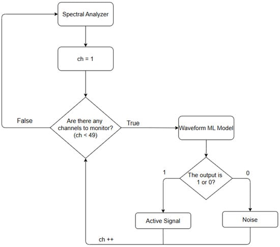 Finally, an algorithm was created to detect active channels in real time using machine learning models as shown in Figure 8. This method collects the characteristics of each channel after the spectral analyzer using an approach very similar to the signal-to-noise ratio model and the learning process, combining the two. These characteristics of each channel are then entered into the models, allowing them to classify these channels as active or inactive. The creation of the two models, KNN and SVM, and the choice of parameters for both will be discussed below.
