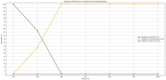 The first method to be tested was the Energy Detection method. Although this algorithm did not involve any learning system, it was tested at all distances, which are 200, 400, 500, 700, 800, 900, and 1000 m. In all of them, the SNR of the two channels being checked was calculated, and if the value was higher than 12, the channel was considered active as explained in the development of the algorithm. In Figure 11, you can see the performance of the Energy Detection method over these different distances. For each distance, an average of the confusion matrix of the two channels tested was calculated in order to unify the results for each range. This figure shows the P d over the testing distances used in this method, which leads to the conclusion that for relatively short ranges of 200 m, the method performs very well, with a detection probability of 100%. However, when the distance increases slightly, leading to a decrease in the channel’s signal-to-noise ratio, performance begins to drop sharply, with only 62% P d at 400 m and no transmission detected on either channel at 500 m. Performance never improved beyond 500 m.