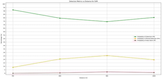The second method tested was the Waveform-Based Detection method with the SVM algorithm. Contrary to the ED method, only the longest distances were used for the performance test, as the shortest distances were used to create the model. The main objective is to understand whether the model created has learning capability, and for this purpose, it was tested up to twice the maximum distance at which the transmission samples were collected, resulting in a maximum tested range of 1000 m. In Figure 12, P d , P f , and P m are represented for each range, 700, 800, 900, and 1000 m. However, to obtain the results of these parameters, the average performance values of the two channels were calculated for each distance, corresponding to the confusion matrix obtained as was performed in the previous method. The model developed using SVM presents many positive results, with the ability to detect transmissions with an effectiveness of around 80% at 1000 m, considering that under these conditions, the SNR is lower than in the transmissions used for learning at 500 m, showing a clear ability to detect communication channels in the VHF band and for learning. An interesting aspect of the model’s P d is that it can be sensitive to external noise propagation conditions that negatively affect signal quality, as can be seen in the P d at a distance of 900 m, which is lower than that at 1000 m, by around 5%, due to the loss of signal quality received by the SDR. In relation to P f , false positives, the SVM model also shows very good results, with probabilities of around 1% for the four distances tested, which means that the user will not receive information about channels that are active when they are not actually active on the system.