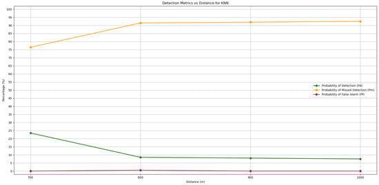 The KNN algorithm for the Waveform-Based Detection method was the last algorithm to be tested, and as in the previous machine learning case, it was tested for the same distances. In Figure 13, the four distances tested and the P d for each of them can be seen, as well as the P m and P f . Once again, the method of averaging the values of the confusion matrix was used to unify the channels over the same distance. The P d with this type of machine learning model fell short of what was expected, with a very low P d of around 8% for 800, 900, and 1000 m, which means that up to 92% of the transmissions made, P m , could not be detected by this model. At a closer distance to the radio transmitter, at 700 m, despite P d being 23%, this value remains very low for a system that needs to detect relatively short voice communications. Regarding P f , performance is excellent since the KNN-based model practically never classified moments when the channel was inactive as transmission, regardless of distance.