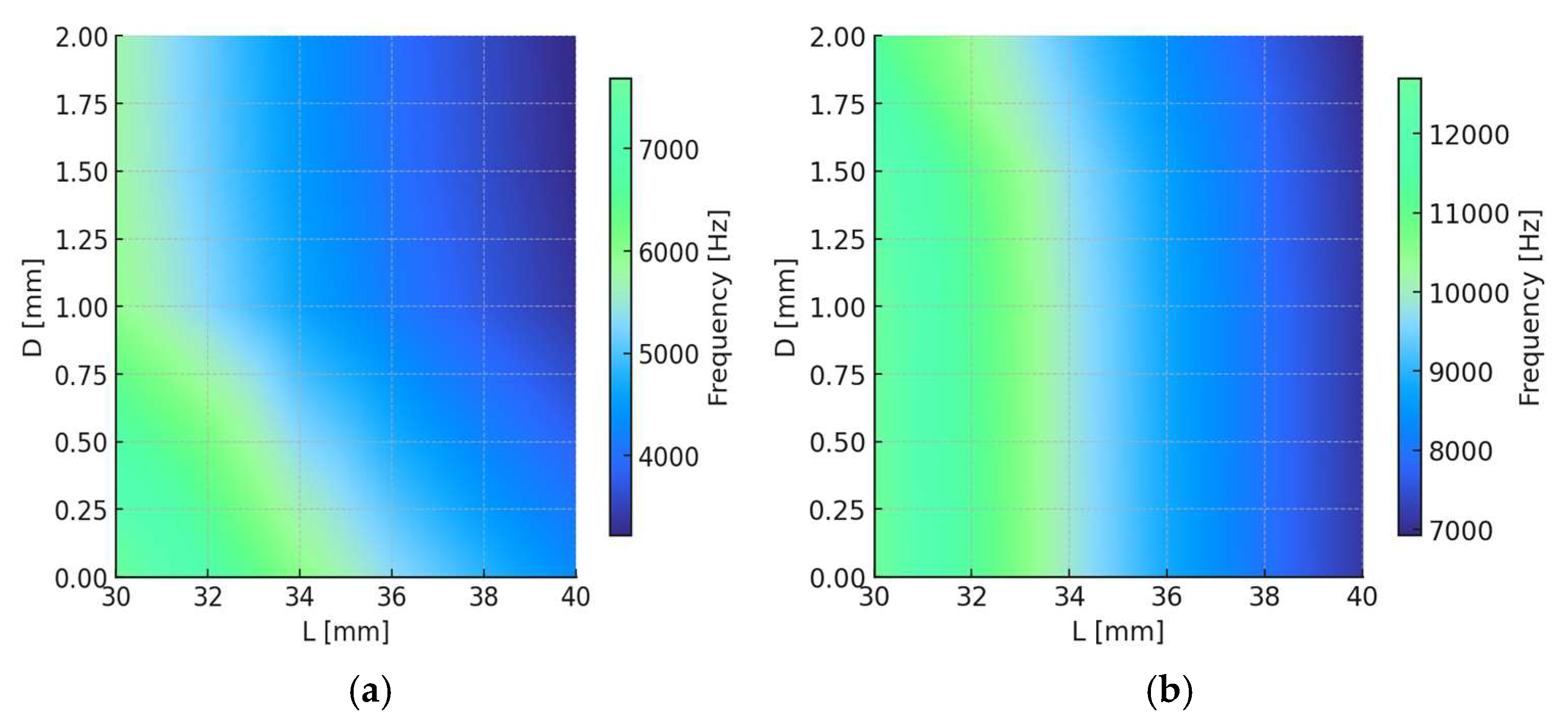 - Design of Experiments (DOE) evaluating the influence of the fiber free length L and proof mass diameter D on the natural frequencies of the fiber–mass subsystem.