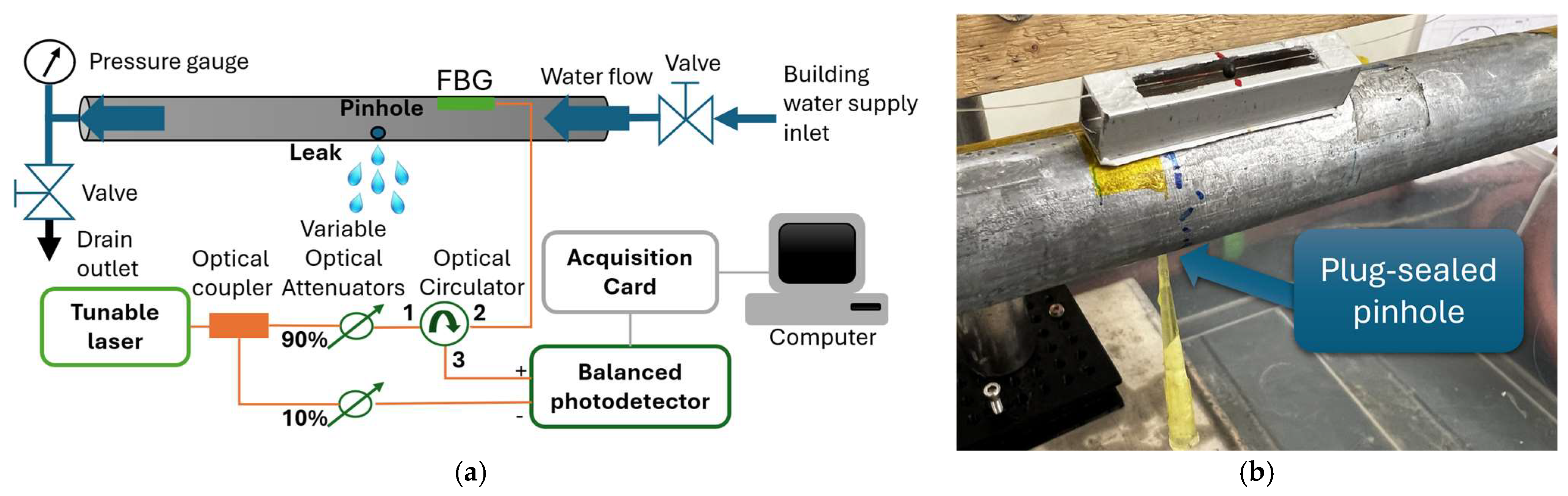 - Li, W.; Liu, T.; Xiang, H. Leakage detection of water pipelines based on active thermometry and FBG based quasi-distributed fiber optic temperature sensing. J. Intell. Mater. Syst. Struct. 2021, 32, 1744–1755. [Google Scholar] [CrossRef]