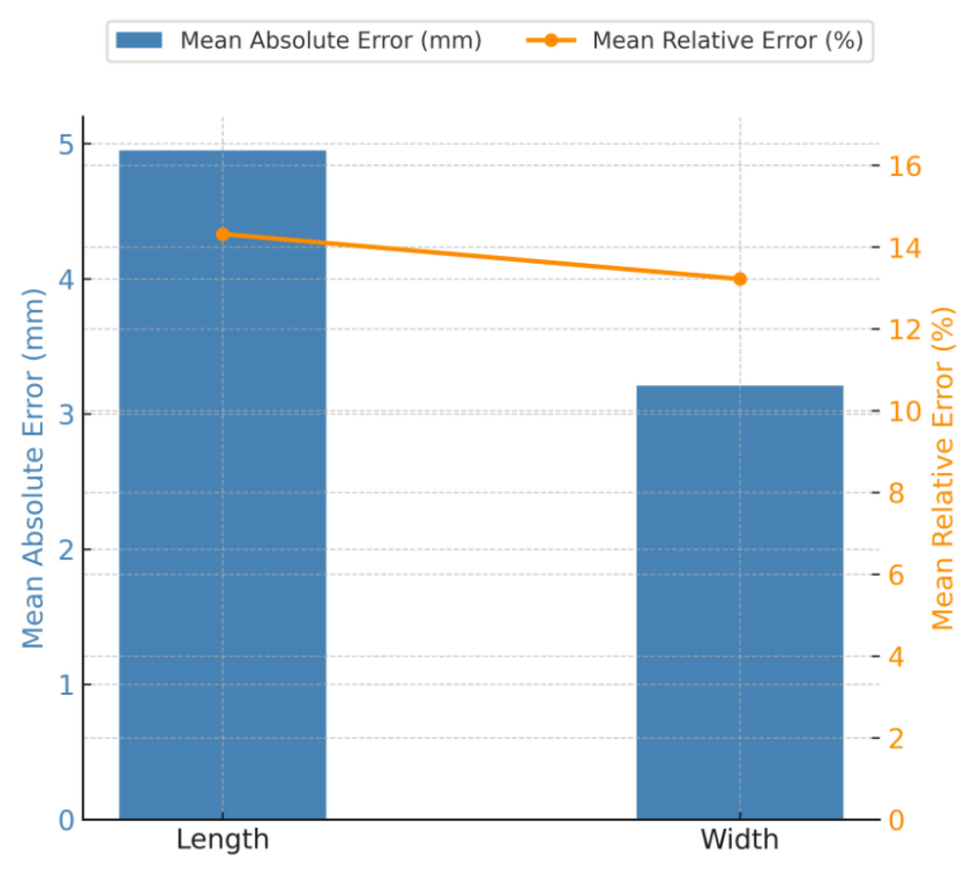 | No. | Actual Length (mm) | Elliptical Major Axis (mm) | Relative Error (%) | Actual Width (mm) | Elliptical Minor Axis(mm) | Relative Error (%) |