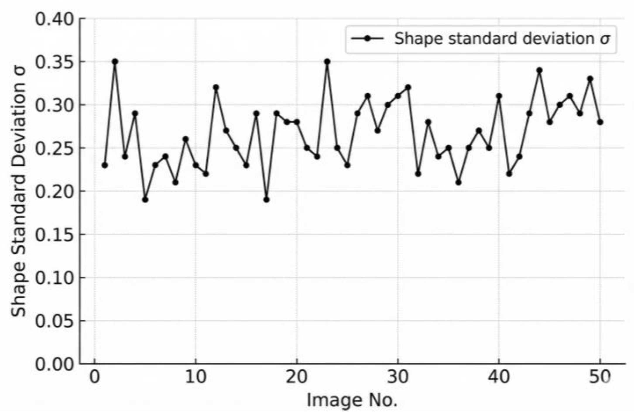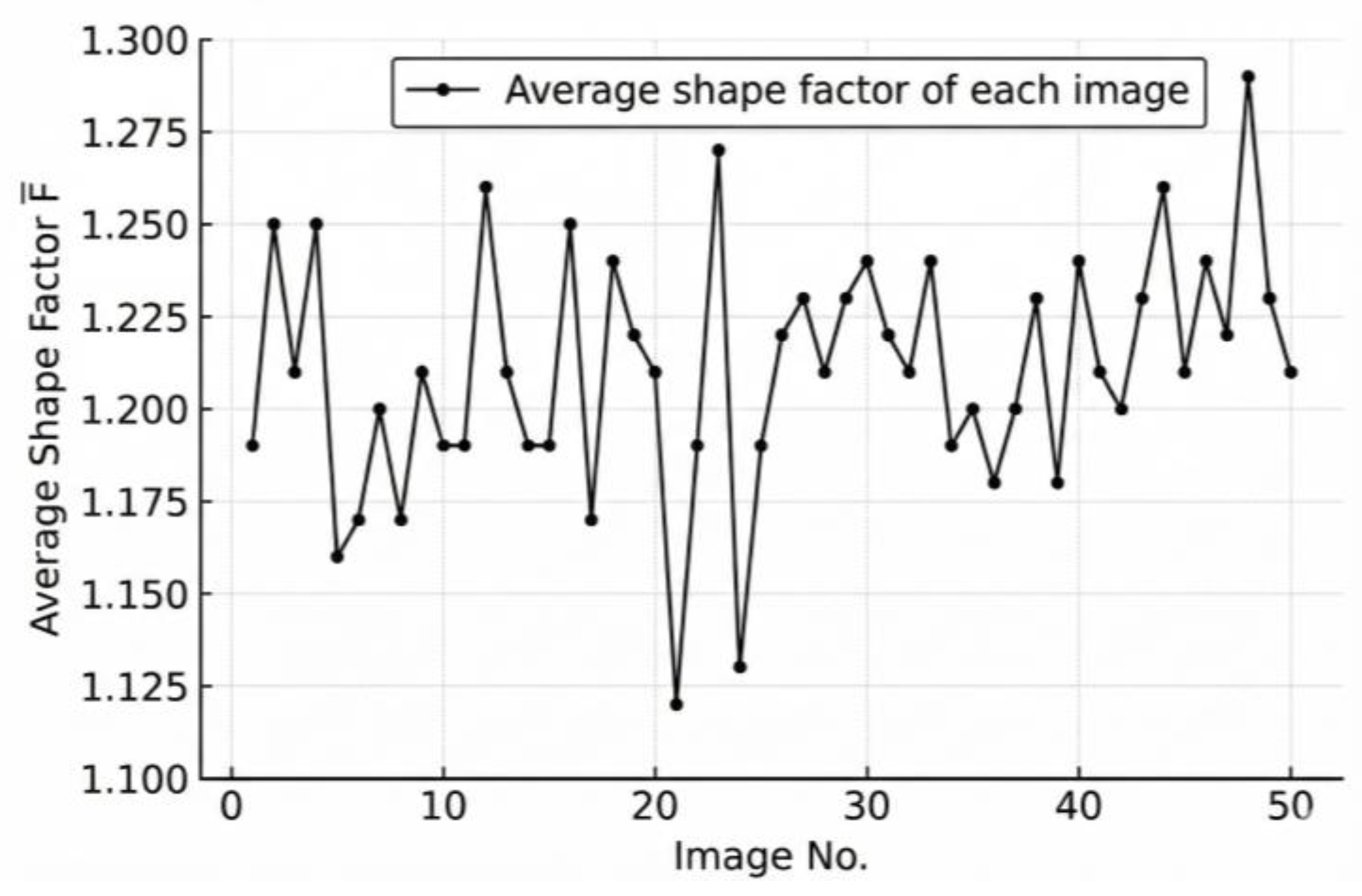 - The morphological characteristics of individual aggregates were quantified using the equivalent ellipse method, in which the shape factor () and its standard deviation () were introduced as the key parameters reflecting particle uniformity and overall shape quality. Based on the analysis of 50 stacked aggregate images containing 1050 particles, the results demonstrate that effectively characterizes the dispersion degree of particle geometries—smaller values correspond to more uniform and better-shaped aggregates, while larger values indicate greater shape variability and poorer overall quality.