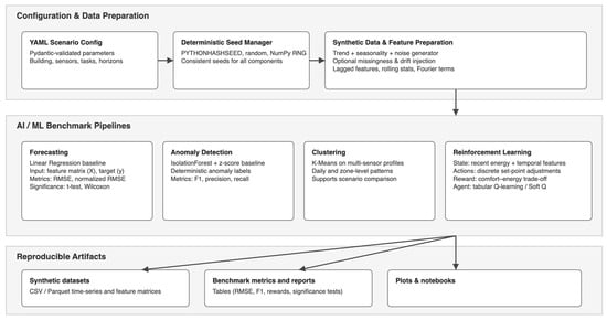 SmartBuildSim implements a unified mechanism for deterministic randomness management to ensure complete reproducibility of data generation, feature engineering, and all machine-learning benchmarks []. The DeterminismConfig model centralises seed configuration and propagates it across all stochastic components of the framework. During initialisation, the helper function configure_determinism() sets the global environment variables (including PYTHONHASHSEED), initialises the Python random module, and configures NumPy’s RNG via a dedicated Generator object. The functions resolve_seed() and create_rng() provide component-level seed isolation: each module (data generator, anomaly injector, feature builder, forecasting pipeline, anomaly benchmark, and RL agent) receives its own reproducible RNG state derived from a global root seed.