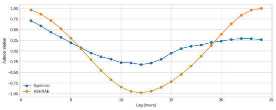 Temporal structure further distinguishes both streams. Figure 4 shows autocorrelation curves for lags up to 24 h. At lag 1, the ASHRAE signal exhibits very strong persistence (≈0.96), whereas the synthetic one decays more rapidly (≈0.48). At lag 24, the ASHRAE series shows a much stronger daily cycle, consistent with its smoother oscillatory pattern. Such differences are expected, as the synthetic generator intentionally avoids imposing strict long-memory behaviour.
