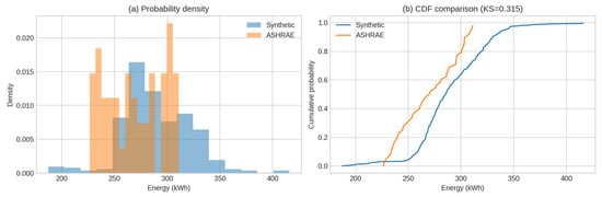 Energy use distribution (a) and cumulative distribution function (CDF) comparison (b) between synthetic and ASHRAE data (KS = 0.315).