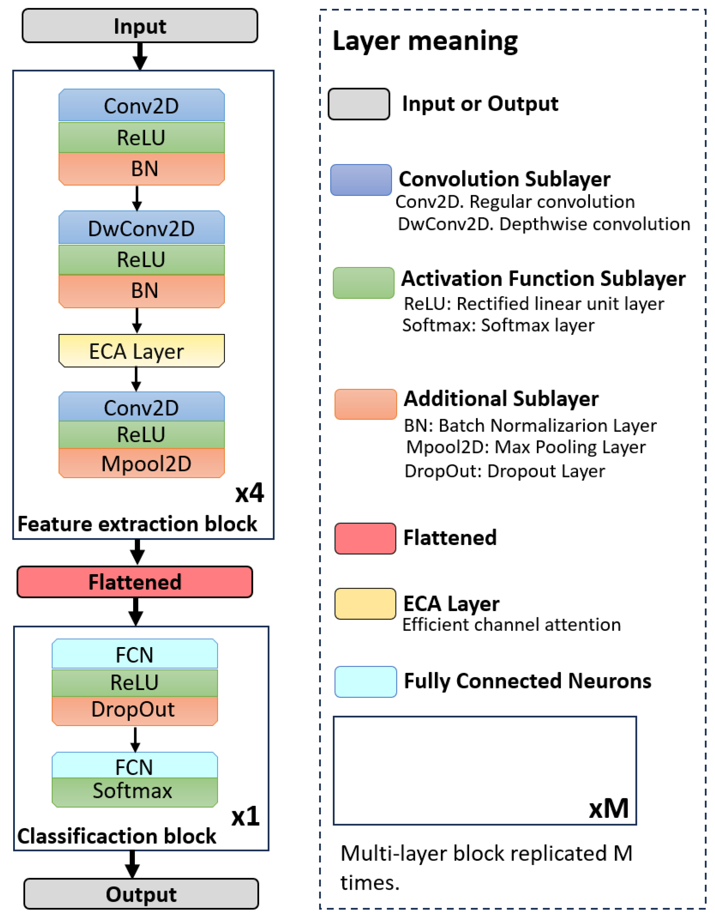 The input layer receives a facial expression image, either sourced from benchmark datasets or captured in real time through a camera or other imaging sensor. The feature extraction stage comprises four blocks, each containing an efficient channel attention (ECA) module and convolutional layers equipped with ReLU activations, batch normalization, and max pooling. The output of this block is a set of feature representations, which are subsequently converted into a one-dimensional feature vector by the flatten layer. The classification block then processes this feature vector to determine the corresponding emotion class conveyed by the input image. The output layer produces the final predicted emotion, which can be utilized in real-time applications. The following subsections provide a detailed description of LiExNet.