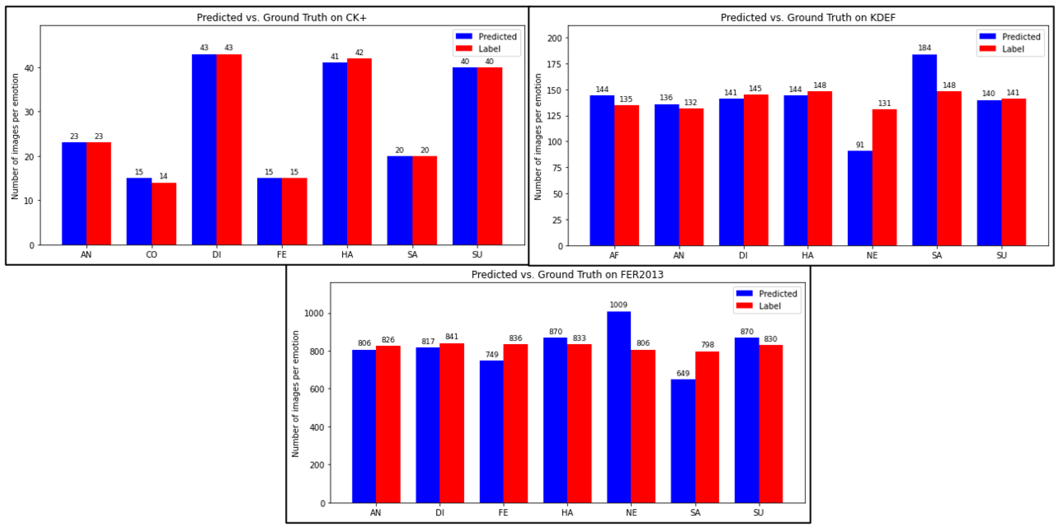 Figure 10. A total of 63 test images were evaluated (21 from each dataset), including 54 images corresponding to Ekman’s basic emotions (9 per emotion), six from the NE class, and three from the CO class.