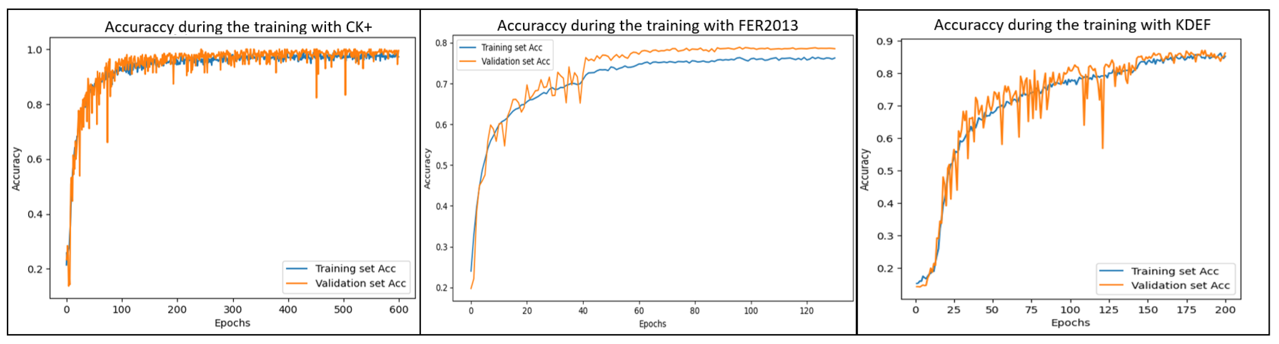 19]. Their approach employed Inception-V3, VGG-19, and ResNet-50, trained on the CK+ dataset. Among these networks, ResNet-50 achieved the highest accuracy (92.32%), followed by VGG-19 (90.14%) and Inception-V3 (89.11%). The models of [