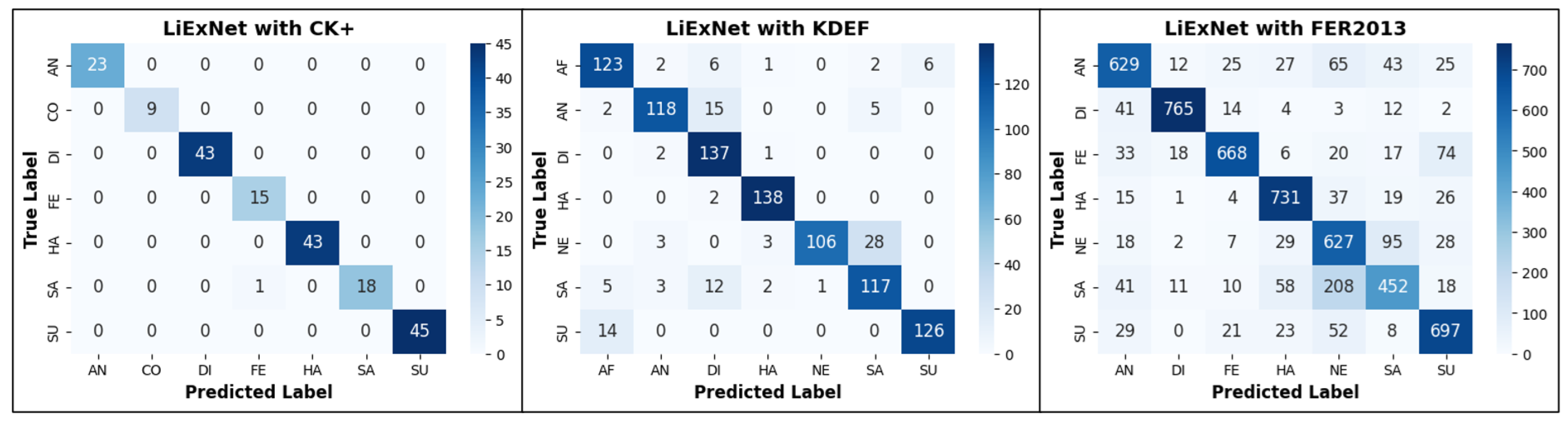 According to the emotion classification analysis conducted on the KDEF and FER2013 datasets, LiExNet achieves class-based recall () values of for CK+, for FER2013, and for KDEF. The highest-performing emotions are HA, SU, and DI, whereas AF and FE exhibit intermediate behavior. The lowest-performing categories are SA, AN, and NE. The Grad-CAM analysis suggests that this behavior arises because HA, SU, and DI exhibit a wide range of expressions and microexpressions, whereas AF, FE, SA, and AN share similar expressions and microexpressions patterns. In contrast, the NE category lacks consistent facial features that can be reliably used for classification.